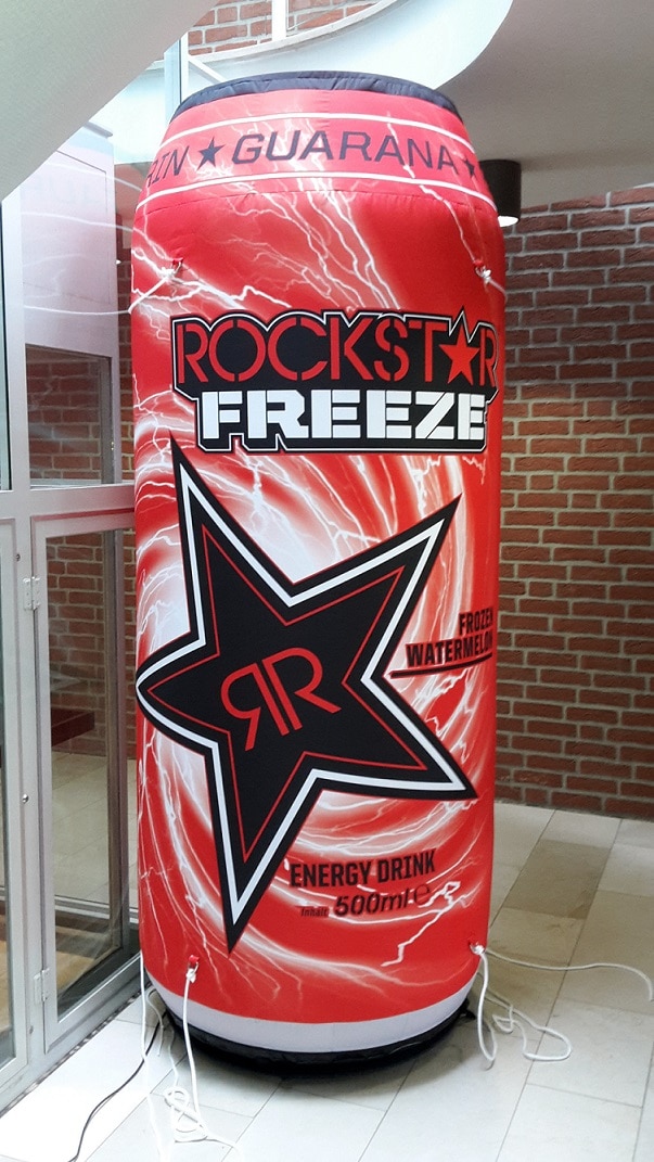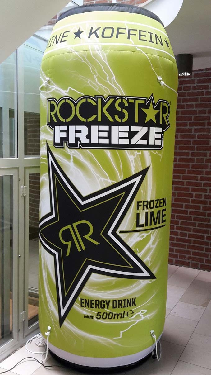For Pepsi we have made 14 inflatable cans in the look of Rockstar Lime and Guarana. A can is about 2.50 m high, has a solid wooden bottom and inflated and ready within a short time. Not only the size draws attention, but also the brilliant print of the can.