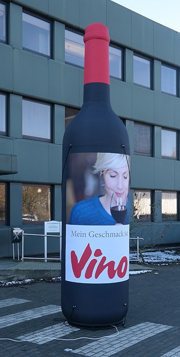 This inflatable wine bottle is approx. 5 m high and was produced for Vino GmbH. The bottle is rather simple and captivates with its great label. This bottle is also a second edition for Vino GmbH.