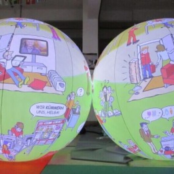 These inflable balls were designed by our customer, are illuminated from the inside and have a diameter of approx. 2 m. The balls are airtight and can also be suspended.