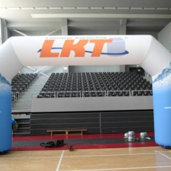 An inflatable arch for the Lausitzer sewage technology should it be. As can be seen here, this was implemented with an outstanding print. The water looks extremly realistic.