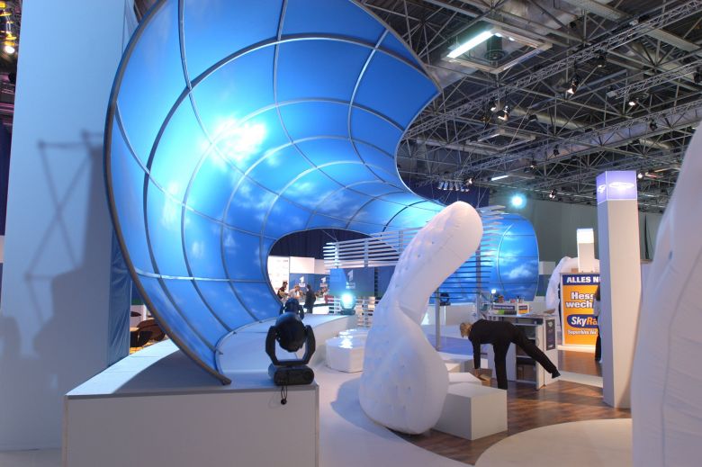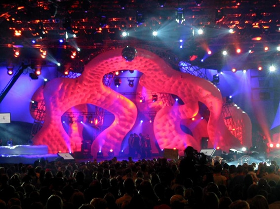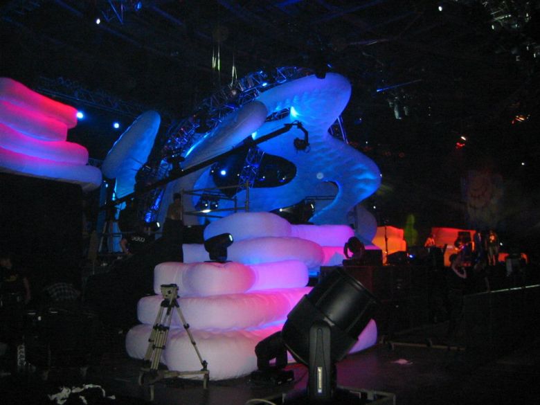 Bei ganz großen Objekten ist meisten Personal von AIR promotion dabei. Die nachstehenden Bilder zeigen das Interieur, das für 13 Musiksendungen von „The Dome” hergestellt wurde. Eine der Voraussetzungen war, dass das verbaute Material sowohl transluzent sein sollte als auch von außen anstrahlbar.