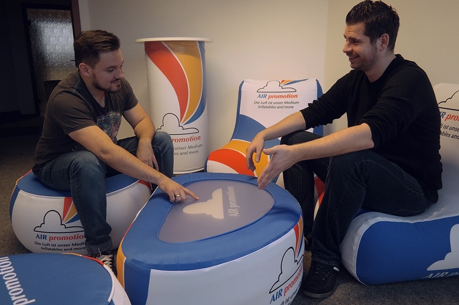 Get in touch with us, so that we can realise your dreams. The minimum order quantity is five objects. Inflatable furniture can be covered with more robust artificial leather or with fully printable polyfabric. They are characterised by their young, modern style and provide a relaxed atmosphere. Our inflatable furniture has that special something.